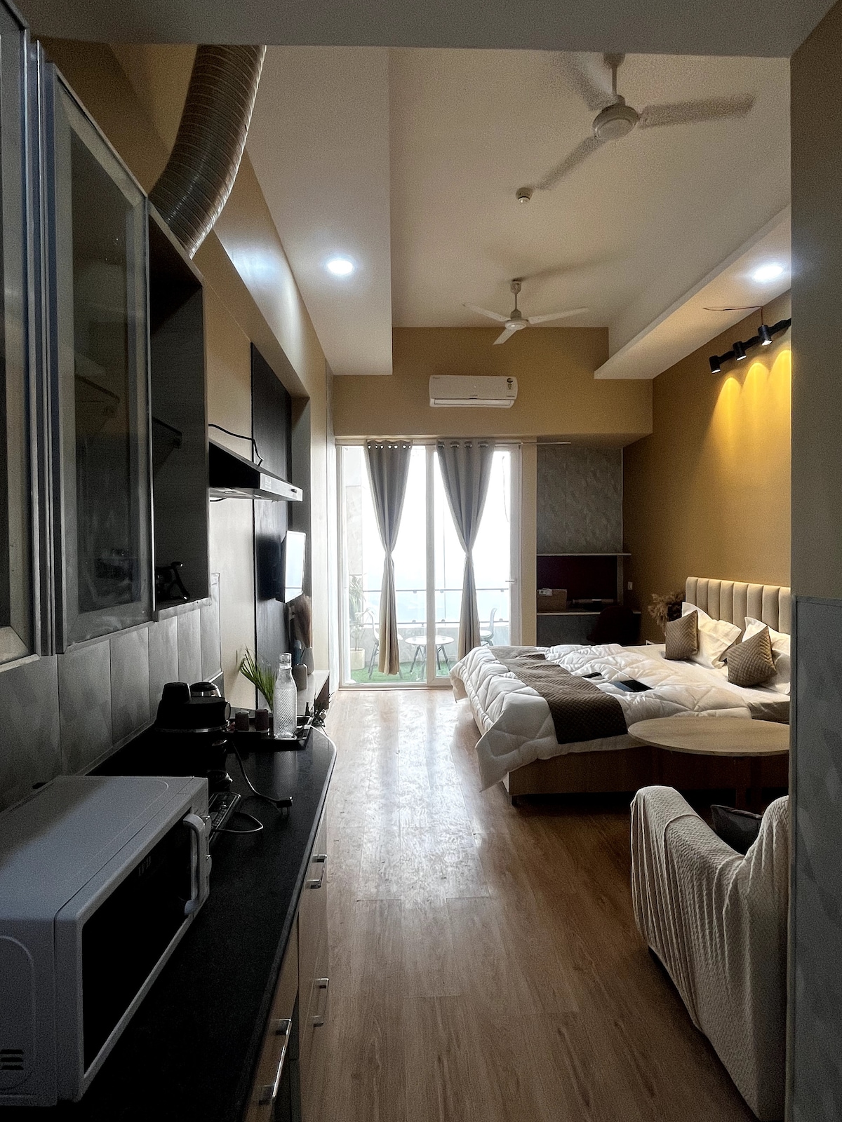 You would have 1RK Private Studio which is located on the top of the gaur city mall and also would like to inform you that on the corridor/lobby, there are little renovation is going on.