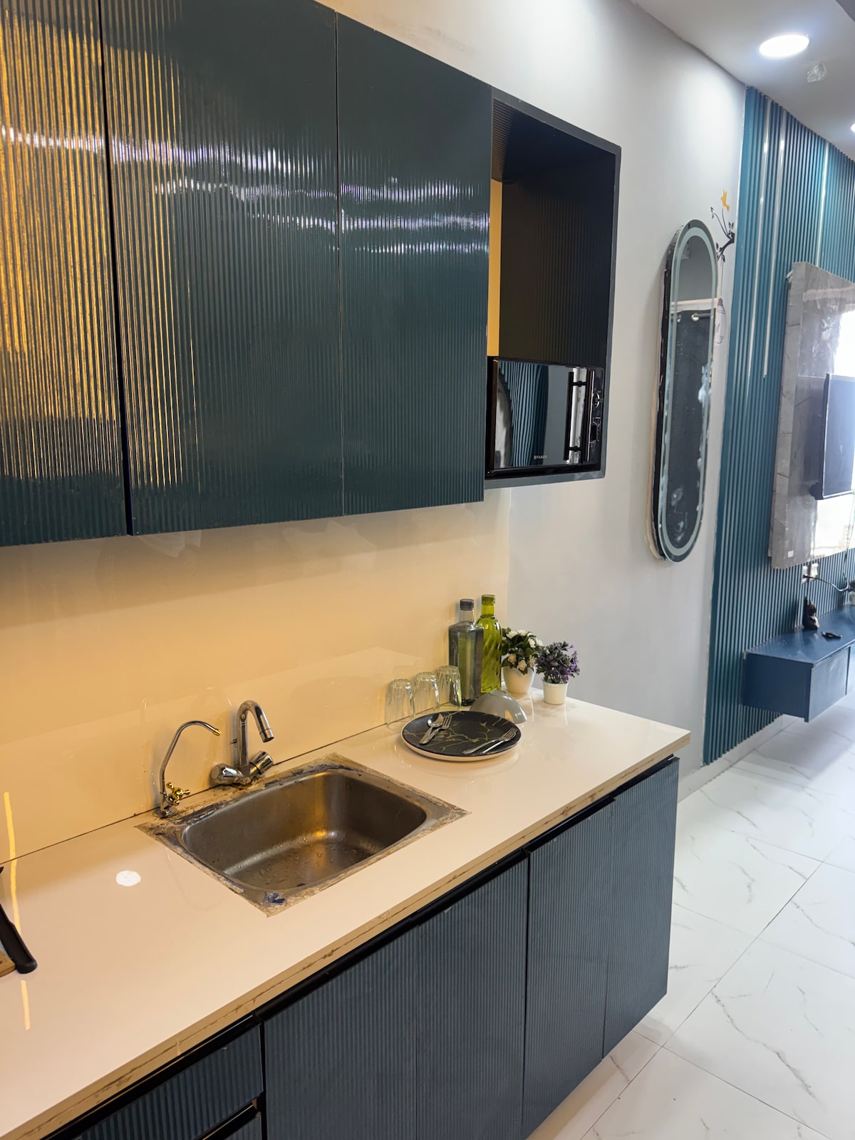 Căn hộ studio phong cách với khu vực sinh hoạt ấm cúng, giường thoải mái, bếp hiện đại và phòng tắm sạch sẽ. Điểm nhấn là đồng hồ TV thông minh xoay từ giường hoặc không gian sống một cách dễ dàng. Được thiết kế với sắc thái thanh lịch của màu xám và trắng, căn hộ mang đến cảm giác yên tĩnh, hiện đại hoàn hảo cho khách đi một mình, cặp đôi hoặc kỳ nghỉ công tác.