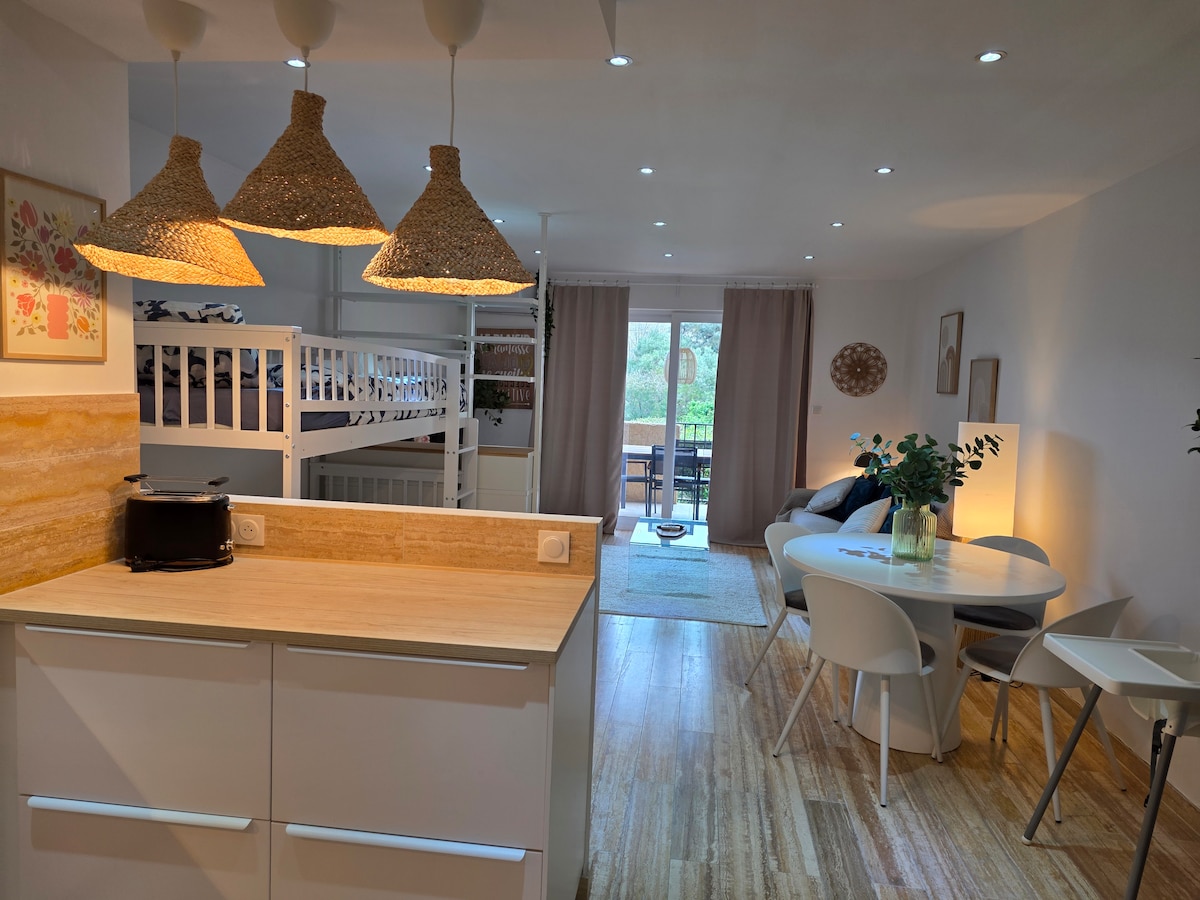 Tôi cung cấp cho bạn studio xinh đẹp rộng 24 m2 của tôi, tận hưởng vị trí trung tâm giữa làng Giens và bãi biển Almanarre. Bến tàu cho đảo Porquerolles cách đó 15 phút đi bộ. Đó là một tổ nhỏ với một phòng khách với nhà bếp, khu vực ăn uống, một khu vực phòng ngủ (sofa giường mới trong 160*200 + 1 tài xế) và một phòng tắm được tân trang lại vào mùa đông năm 2024. Một ban công lộ thiên là để tận hưởng ánh nắng mặt trời cho bữa sáng và một chỗ đỗ xe hoàn thiện chỗ ở.