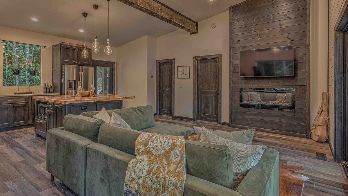 Enjoy lake and mountain views in this updated oasis amongst the trees. Whether you're looking for an outdoor adventure or a rejuvenating escape, we have it all! Situated on a five acre lake, enjoy the private dock and use of our two paddle boards and canoe. After a day of hiking, decompress in the hot tub and sauna. Tons of space to gather both indoors and outdoors, we hope you'll enjoy all the modern amenities while reconnecting with nature. Just 12 minutes to downtown Ellijay!