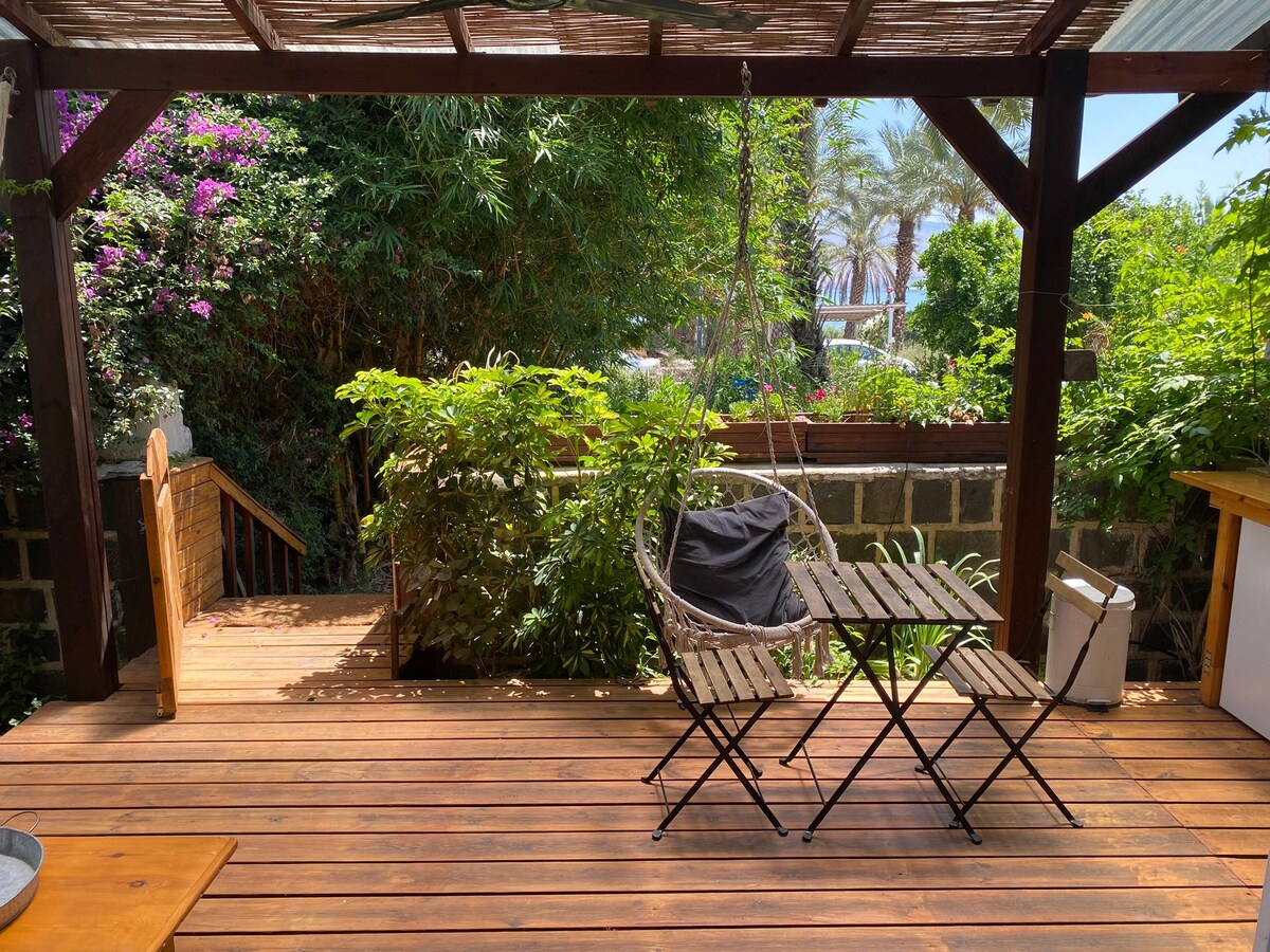 This private suite is a simple specious studio which is a new Extension of an old house with black stone wall. My great grand parents lived here as one of the first 8 original houses in Kinneret, from the 1908th . The space is part of the house with its own entrance- an outdoor terrace where the kitchen/entrance area is and an outdoor bathtub. The house is located 400 meters from the sea of Galilee (across road 90).