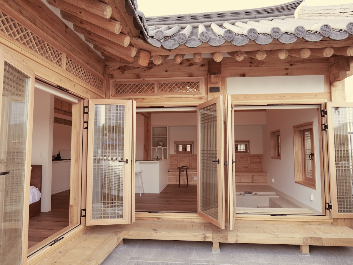 Một hanok mới với vẻ ngoài thanh bình và một loại gỗ cổ điển bật đúng giờ để tạo ra một bầu không khí sâu sắc. Kết cấu của cây cổ thụ, đã được tan chảy tự nhiên thành một cấu trúc được cắt tỉa trơn tru, mang lại sự ấm áp cho không gian và nội thất là sự pha trộn chiết trung giữa vẻ đẹp hiện đại và truyền thống thu hút sự chú ý của người xem. Khi bạn lên tầng hai, bạn sẽ có một thế giới hoàn toàn khác. Một sân thượng motif kỳ lạ của Bali và bể sục mang lại cho bạn cảm giác như ở nhà trong thành phố. Với nội thất tự nhiên, đạo cụ dệt có tông màu mềm và cây xanh, không gian này thực sự là một nơi thư giãn cơ thể và tâm trí của bạn. Với sự hòa quyện hài hòa của sự nhạy cảm phương Đông và kỳ lạ trong quá khứ, hanok này là một không gian tạo ra một trải nghiệm độc đáo cho những người ở lại, ngoài một ngôi nhà đơn giản.