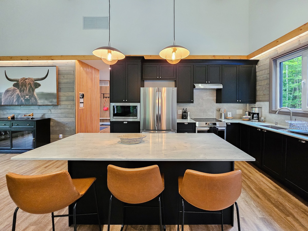 Chalet en pleine nature avec vue sur la montagne. Spa extérieur couvert ouvert à l’année, foyers au bois intérieur et extérieur, planchers chauffants et BBQ. Cuisine complète avec café inclus. Trois chambres : suite des maîtres avec lit king et foyer au gaz, 2e chambre avec lit queen et mezzanine avec lit queen. Terrain de 5 acres avec 2e phase locative prévue en 2026. Parfait pour vous ressourcer. No enr. 309551 exp. 2026-06-08.