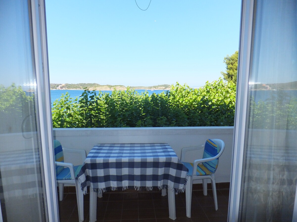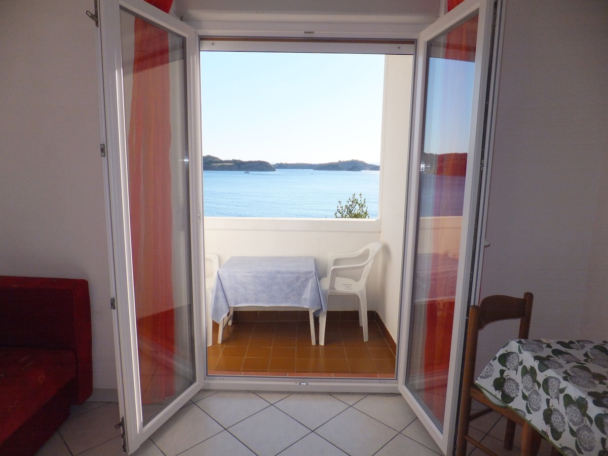 Apartman se nalazi u prizemlju jednokatne kuće, ima 50 mq , jednu spavaću sobu, zasebni dnevni boravak gdje se nalazi kutna garnitura na razvlačenje za 2 osobe. gleda prema jugu. Ima natkrivenu terasu i veliku okućnicu od 2000 qm , na kojoj se nalazi parkiralište ,voćnjak i maslinik.Posebno je pogodan za obitelji koja imaju malu djecu ili kućne ljubimce. 20 m od kuće nalazi se malena trgovina sa svježim pekarskim proizvodima.