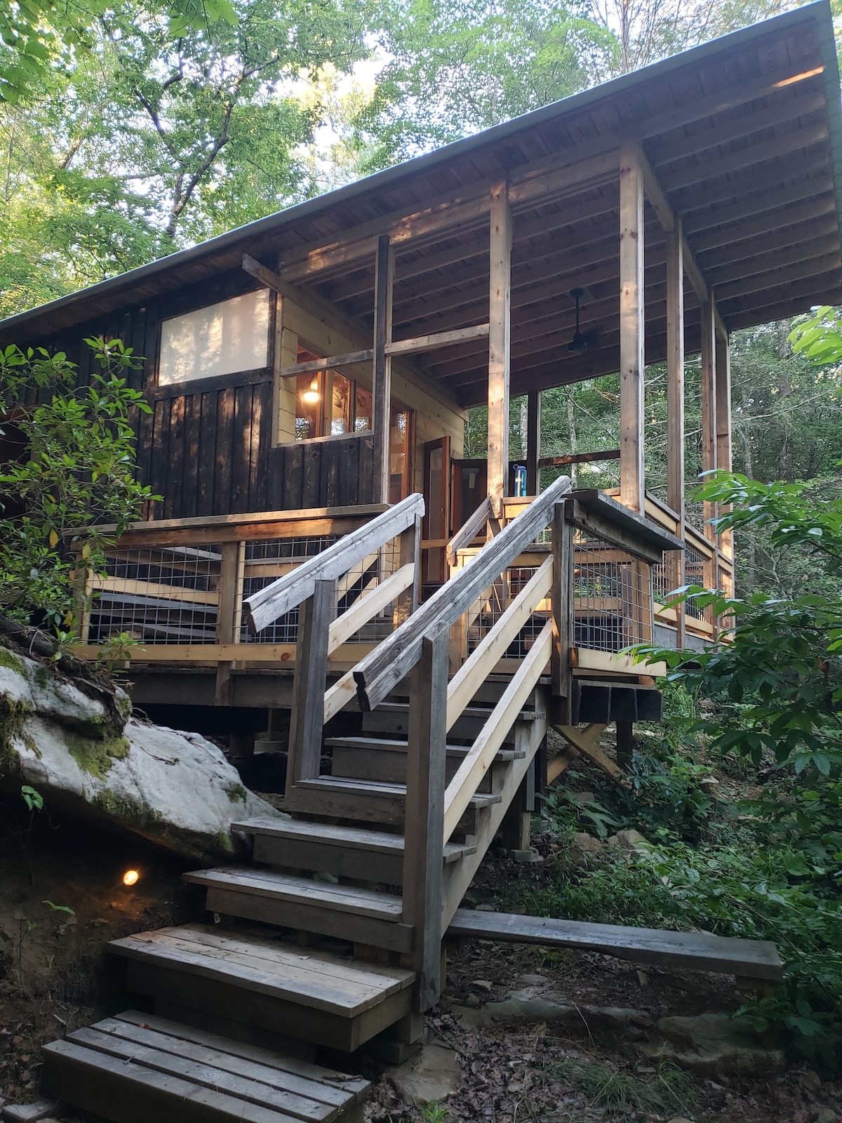 This unique elevated cabin is built over a natural spring and has a private rock shelter patio and fire pit area. A drop down deck creates a very open feeling punctuated by views of the stream through the trees. Built mostly from timber and stone harvested from the property the cabin features Oak hard wood floors and large glass windows and French doors. The cabin does not have a kitchen or bathroom. A large common area with an outdoor kitchen and bathhouse is less than a minute walk away.