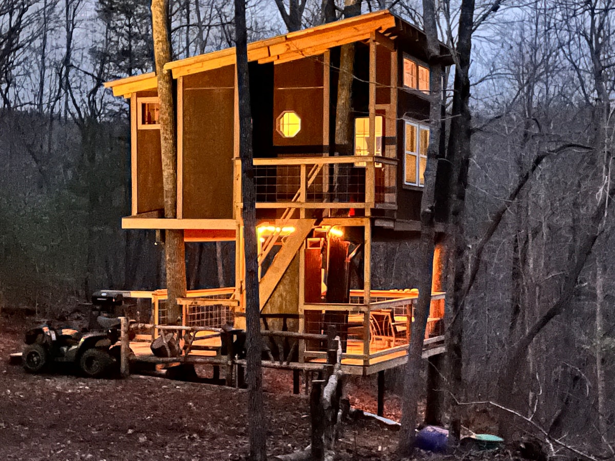 This is a unique, newly built Treehouse (‘23) on 10 wooded acres near Watts Bar Lake. Nearby marinas, restaurants, hiking, waterfalls & a short drive to whitewater rafting & Gatlinburg! Enjoy the peace & quiet of your private deck overlooking a small Holly grove, lush forest & seasonal creek! Fire pit w/ sitting area, outdoor kitchen & BBQ. Comfy space upstairs w/queen memory foam bed, futon loveseat, full bath, fireplace & mini kitchen. Seasonal Kayaks. No pets or kids under 12!