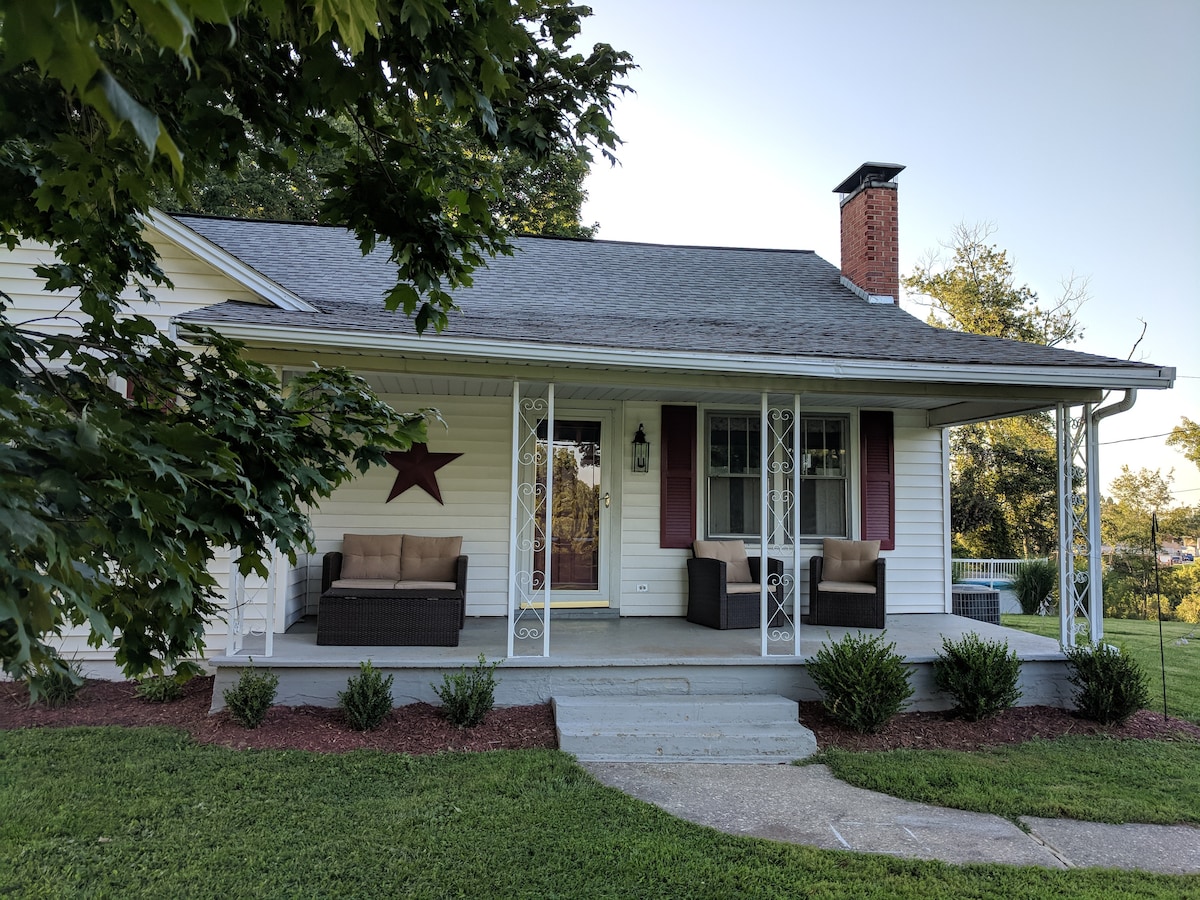 The Bluebell is a farmhouse located on the rolling hills of Dry Ridge Kentucky. It has a wonderful front and back yard especially great for children. It has a charming dining area with a fireplace and a fully stocked kitchen. There's a sunroom looking out into hay fields where deer and turkey regularly roam. There is a terrific front porch to watch the sunsets and peaceful meandering of the cows. Come out of the city lights and find some peace of mind under the stars. (8.6 miles from the Ark).