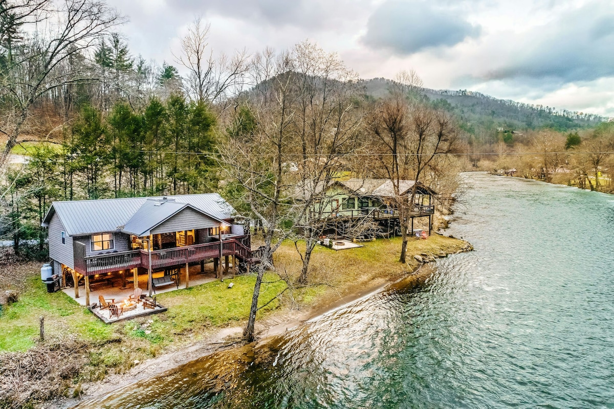 2BR riverfront stay with a grill and hot tub