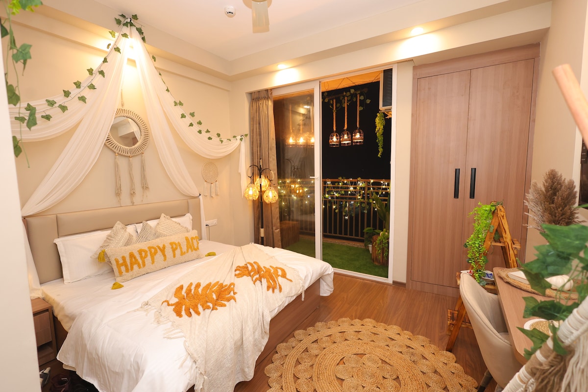 Good Monthly stay discounts available. Kick back and relax in our elegant & fully furnished studio. The earthy interiors will calm you like a boutique hotel experience. A combined charm of English design elements and luxury that offers comfort and style in every corner. We've designed this space with the same care and attention to detail as we were to live here ourselves, prioritizing comfort, style, and authenticity. Top floor | Fast WIFI | Private Balcony | Heart of Noida