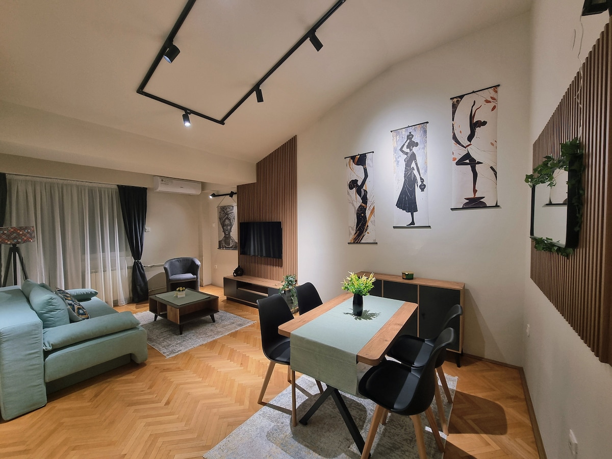 Stay in this peaceful and modern two-bedroom apartment, perfectly located in the city center, right next to the Vardar River. Enjoy a calm atmosphere with everything within walking distance. Being next to the river makes the apartment ideal for morning walks, relaxing evenings, while still being just minutes away from everything. The apartment offers a bright and comfortable interior, a fully equipped kitchen, fast Wi-Fi, and air conditioning, making it ideal for short or longer stays.