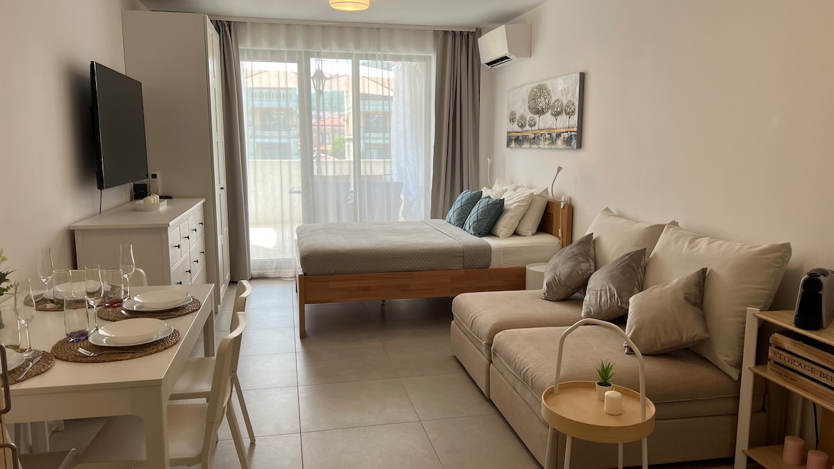 Đây là một căn hộ riêng đáng yêu với một phòng ngủ có giường cỡ KING (220 cm X 200 cm). Một phòng khách ấm cúng với khu vực bếp đầy đủ tiện nghi với bếp, lò vi sóng, máy rửa bát và máy giặt quần áo. Tất cả những gì bạn cần cho một kỳ nghỉ ven biển thoải mái. Khu vực phòng khách/bếp có ghế sofa kéo ra thoải mái cho hai người ngủ (160 cm X 200 cm). Một phòng tắm đầy đủ với buồng tắm vòi sen, hành lang /khu vực đi bộ và ban công với đồ nội thất sân vườn - một bàn và 2 ghế.