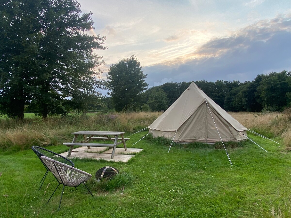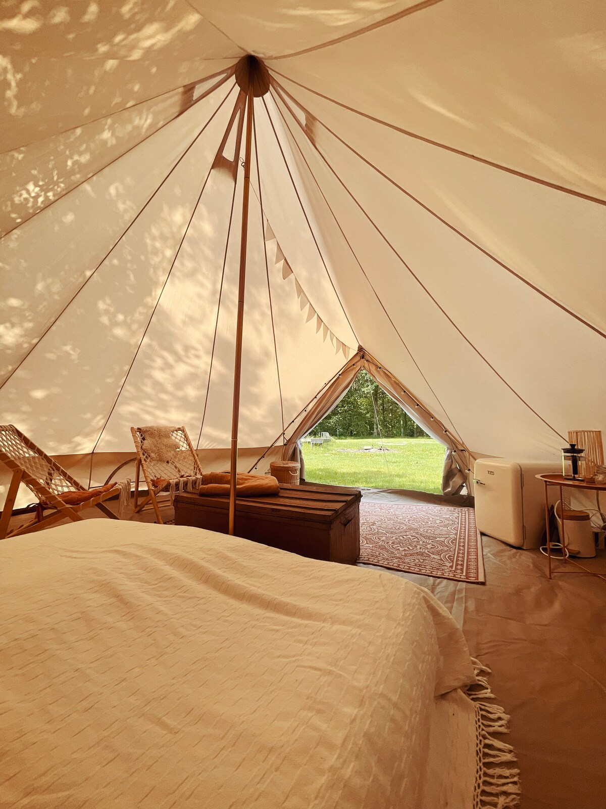 Spacious bell tent for two with a smart, pole-free design and a comfortable double bed (160 × 200 cm). The outdoor kitchen is nearby, and the tent offers views over the surrounding meadows. Inside you’ll find two chairs, with plenty of outdoor seating to relax and enjoy nature.