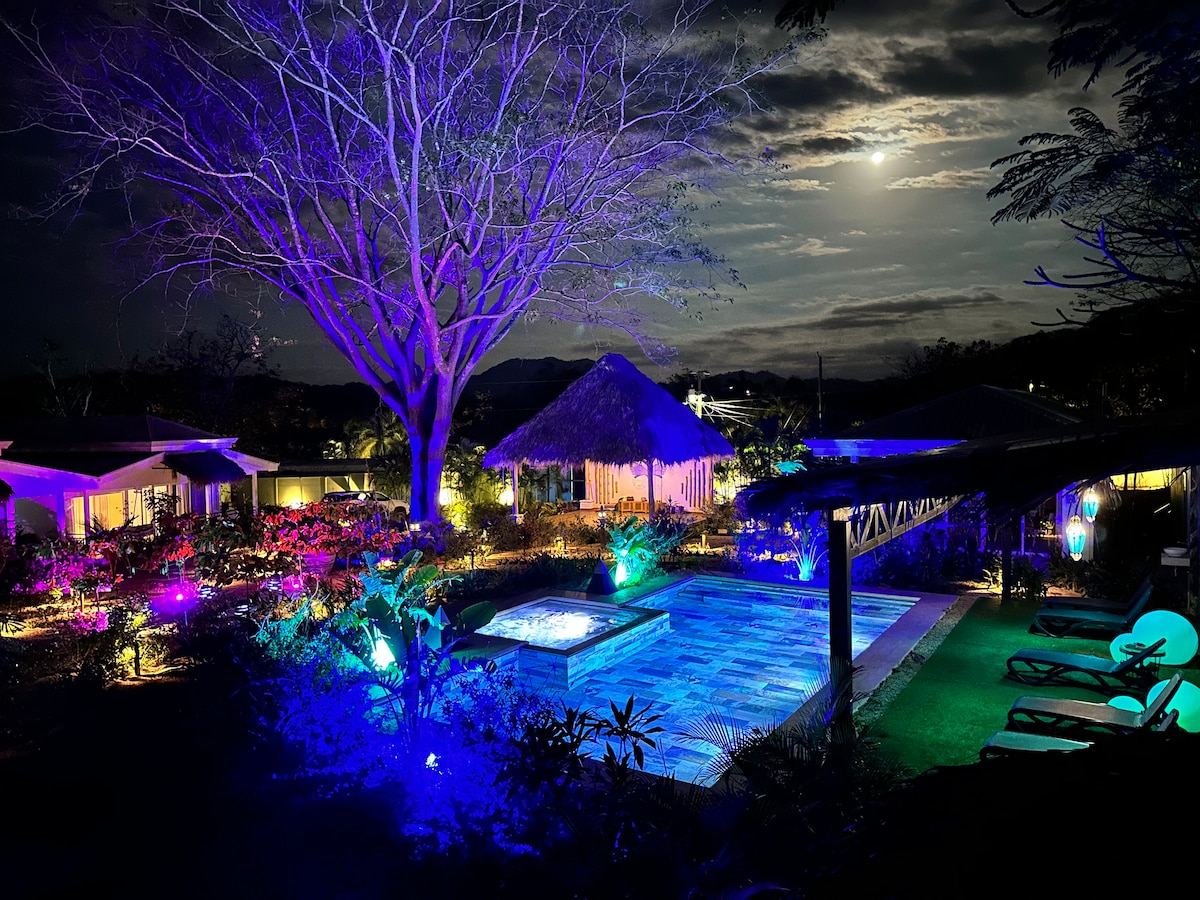 Casa Jaguar nằm trong cộng đồng Rancho Villa Real gated chỉ cách bãi biển Tamarindo 5 phút lái xe. Nhà đẹp với 3 phòng ngủ, tất cả đều có phòng tắm khép kín mang lại sự riêng tư cho tất cả các khách. Thiết kế ý tưởng mở nhìn vào khu rừng và hồ bơi riêng. Ngoài trời và trong nhà hợp nhất trong toàn bộ không gian. Ngoại thất cung cấp một không gian thư giãn để tận hưởng hồ bơi vào ban ngày và ban đêm không gian ngồi với hố lửa. Có Phòng xông hơi khô và tạ để làm cho thời gian lưu trú của bạn ở đây giống như một nơi nghỉ dưỡng spa.
