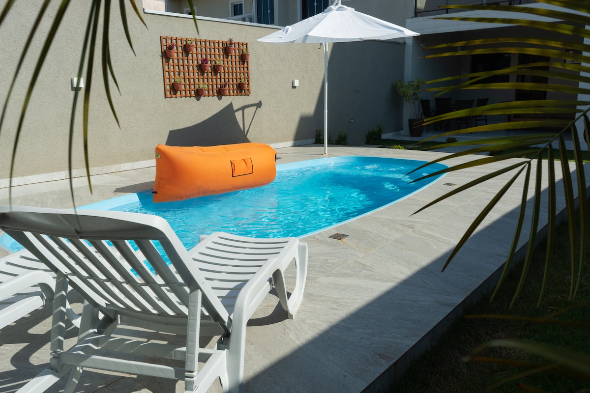 CHỖ Ở TIÊU CHUẨN CAO với hồ bơi nước nóng 32° C🌡️, 3 phòng ngủ, tất cả đều có điều hòa không khí 12.000 BTU (chỉ làm mát), 2 trong số đó là phòng tắm khép kín, tiệc nướng hướng ra hồ bơi, nhà bếp đầy đủ, phòng giặt ủi, 2 chỗ đỗ xe cho ô tô cỡ trung bình. ĐIỆN ÁP CỦA TÀI SẢN 110V. Chúng tôi CUNG CẤP GA TRẢI GIƯỜNG, (Gối có chăn, ga trải giường và chăn vi sợi). CHÚNG TÔI KHÔNG CUNG CẤP KHĂN TẮM VÀ KHĂN MẶT. CHÚNG TÔI CHẤP NHẬN THÚ CƯNG NHỎ.