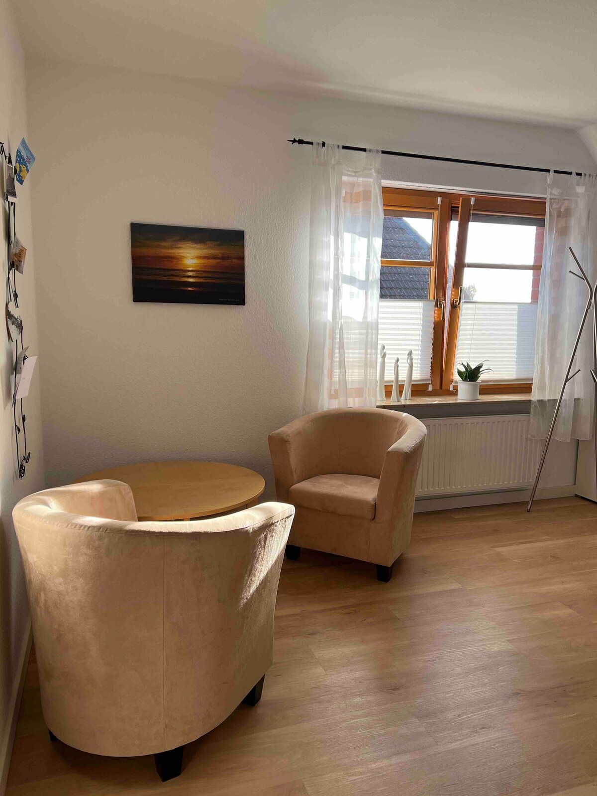 Unser einfaches kleines Häuschen bietet im Erdgeschoß eine gut ausgestattete Pantry, Duschbad/WC, Essplatz, Kuschelsofa und Kachelofen. Im Obergeschoß (Raumspartreppe, siehe Fotos) Boxspringbett (1,40x2,00 m), SAT-TV, großer Schreibtisch mit Aussicht. Vorm Häuschen befindet sich ein hübscher kleiner Gartensitzplatz mit privatem Deichzugang. Wir freuen uns auf euch!