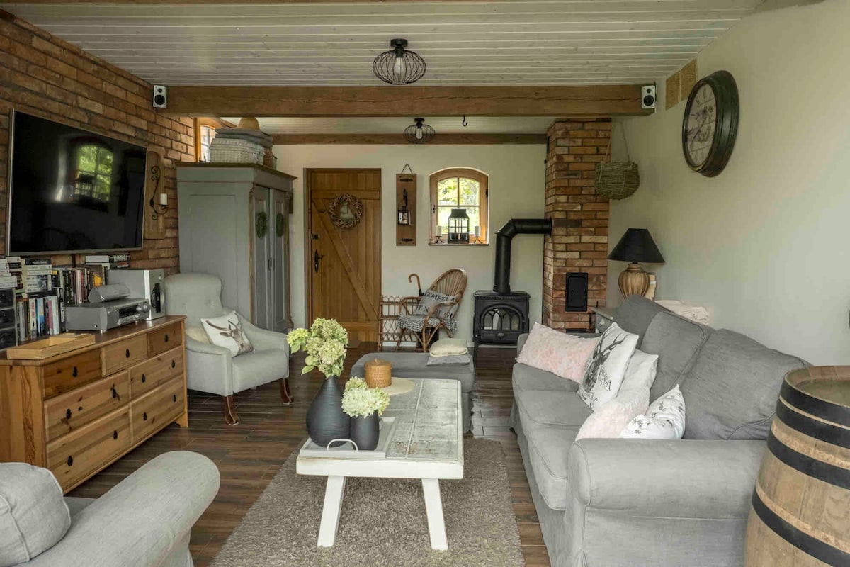 Chào mừng bạn đến với nhà nghỉ thôn dã quyến rũ của chúng tôi ở Villa Mycyna, nằm ngay trung tâm thiên nhiên. Mỗi nhà nghỉ thôn dã có 2 phòng ngủ, bếp đầy đủ tiện nghi, phòng khách ấm cúng với lò sưởi, phòng tắm hiện đại và sân thượng nhìn ra vườn. Có bồn tắm nước nóng trong vườn, bếp nướng, xe đạp và phòng trò chơi. Nơi hoàn hảo cho các gia đình, cặp đôi và nhóm bạn bè đang tìm kiếm sự yên bình và thoải mái gần hồ và rừng.