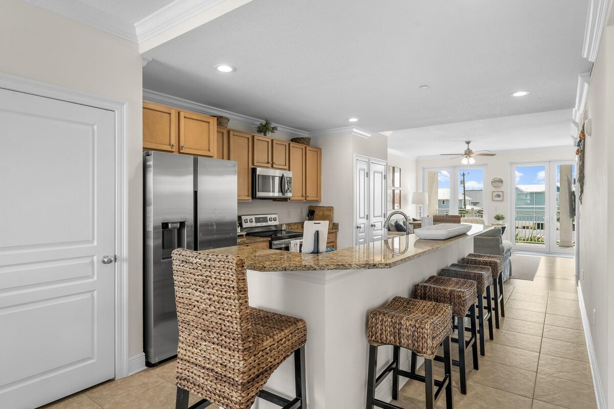 White sand beach just steps away & beach views. Spacious end-unit, on the beach side of Hwy 98 — walk to Mango Marley's and NEW "Bear Pizza". Coffee, ice cream, and several shops are only a 2-minute stroll away. 2 King suites (one with 2 twin beds) both with TVs Quality queen sleeper sofa 70" TV in the living area Washer & dryer High-speed WiFi 3 private decks with beach views/sunsets Grill Gas firepit Outdoor HOT shower Beach/fishing cart Beach chairs Bikes Extra parking
