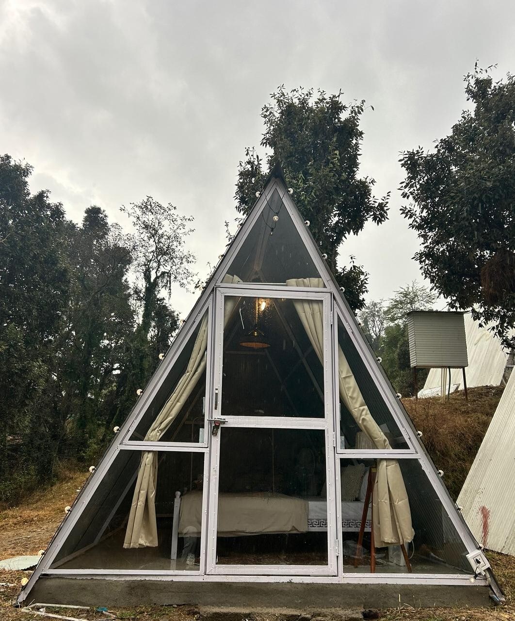A-Frame Nest 01 | Peaceful Farmstay 🌲 Key Highlights – A-Frame Nest | Gwal Tikkar • 🏕 Cozy A-Frame accommodation ideal for 2 guests • ☕ Mini kitchenette with butane canisters — perfect for light meals (Maggi, coffee, sandwiches, bread omelette, etc.) • 🌄 Peaceful village setting within the campsite — serene mountain escape • 🍲 Access to in-house kitchen to order fresh local Himachali delicacies • 📶 Good 5g mobile connectivity for a remote working requirements