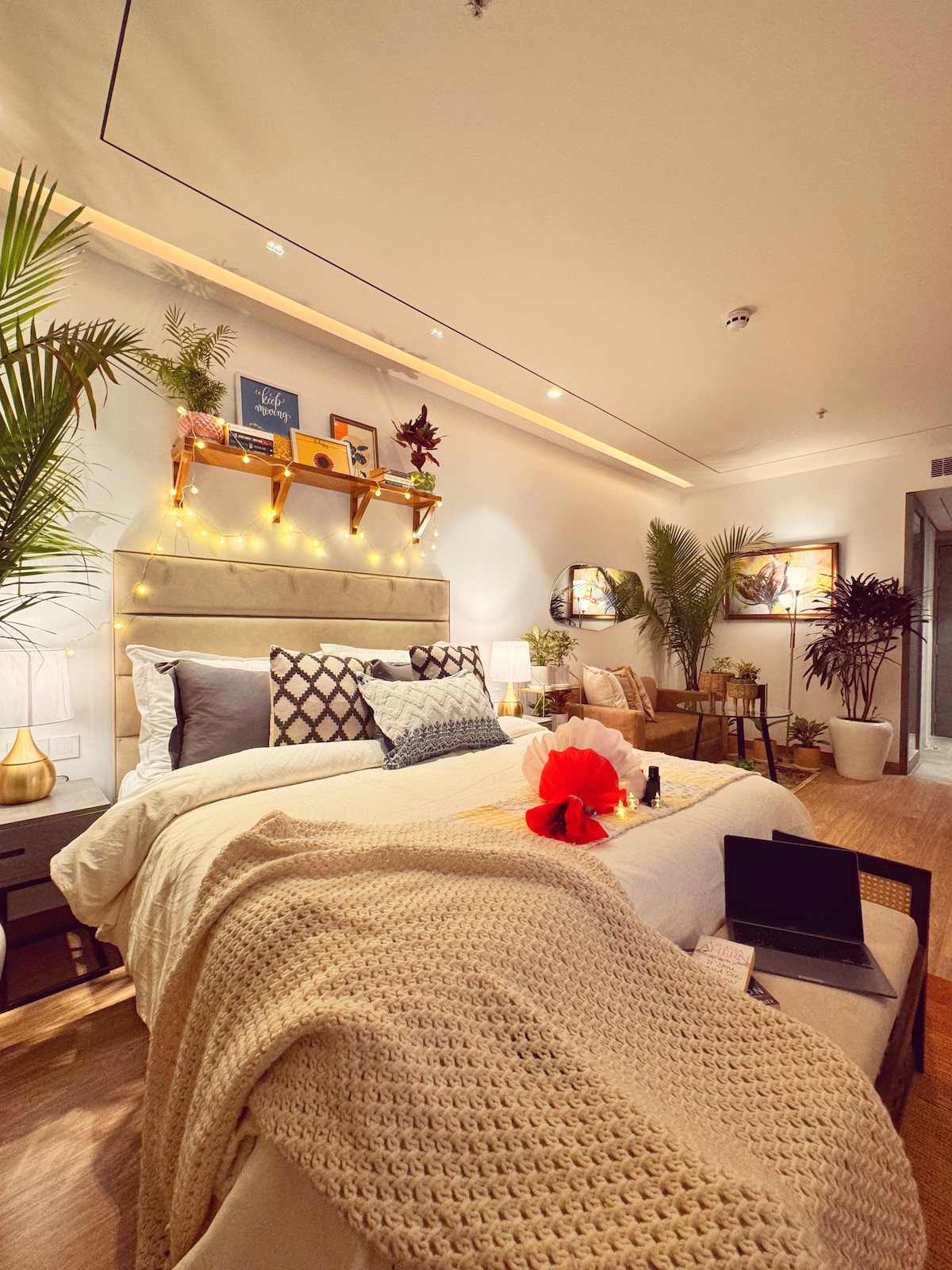 Hãy đến, yêu sự quyến rũ độc đáo của căn hộ theo chủ đề boho này ở Gurgaon. Căn hộ ấm cúng này tỏa ra một bầu không khí ấm áp, nghệ thuật mời gọi sự thư giãn. Vị trí: Nằm trên con phố cao nhộn nhịp của Joystreet, bạn sẽ tìm thấy một loạt các món ăn ngon tại các nhà hàng bên dưới, các cửa hàng thời thượng, quán cà phê địa phương và trải nghiệm rạp chiếu phim tại Inox chỉ cách đó vài bước chân. Mọi người đều được chào đón! ✿ Điều hòa tập trung, chúng tôi không thể thay đổi nhiệt độ, tòa nhà có tất cả các điều khiển.