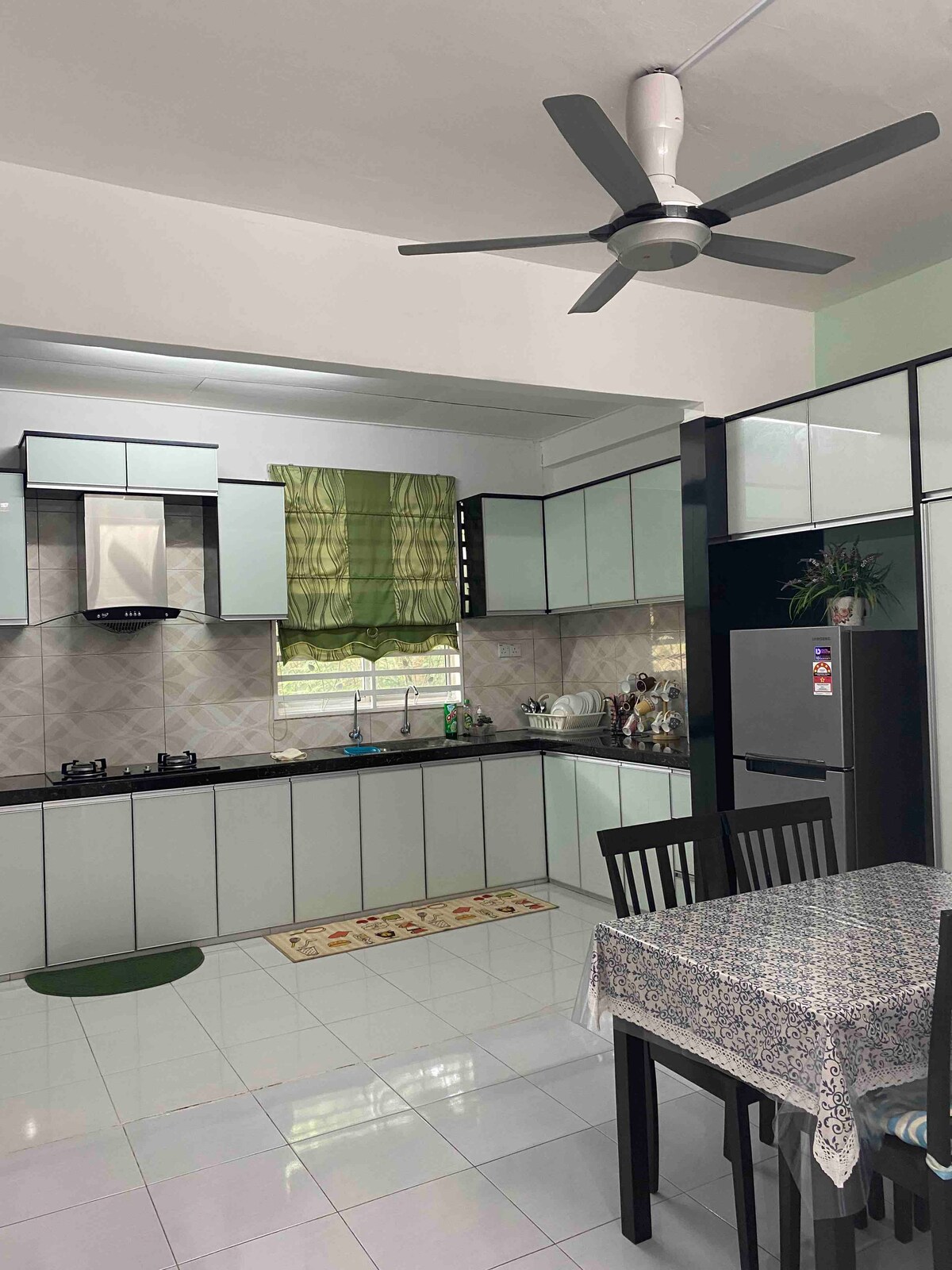 Nhà một tầng bán độc lập 3 phòng ngủ 🛏 Phòng ngủ chính: Giường cỡ Queen kèm phòng tắm + 2 Sejadah (thảm cầu nguyện) 🛏 Phòng 2: Giường Queen 🛏Phòng 3: Giường siêu đơn (Phòng 2 & 3 dùng chung phòng tắm) 👨👩👧 Thoải mái cho 5, tối đa 8 người 🛋️ Nệm trải sàn bổ sung được cung cấp theo yêu cầu (áp dụng phụ) ❄️ Air-Con trong tất cả các phòng ngủ + khu vực sinh hoạt và ăn uống Wifi 📶 miễn phí 🍳 Bếp: tủ lạnh, bếp từ, máy nướng bánh mì, bình lọc nước (nóng/lạnh), nồi cơm điện, máy sấy tóc, bàn ủi và cầu ủi