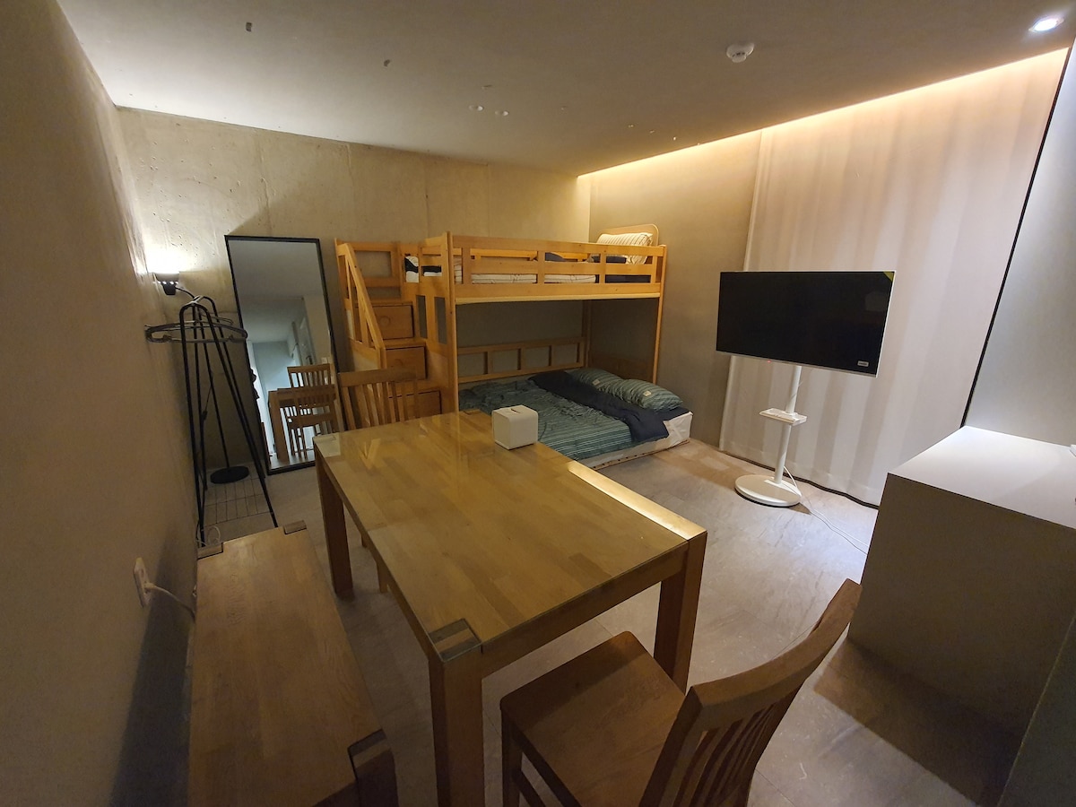 Dongmyeong Home là một chỗ ở riêng nằm ở Dongmyeong-dong, một địa điểm nóng ở Dong-gu, Gwangju. Mặc dù khu phố có dân số nổi lớn, nhưng nhà của chúng tôi mang đến một môi trường cực kỳ yên tĩnh. Đây là nơi để bạn ở ngay cả khi bạn bỏ lỡ một chuyến xe buýt đêm khuya hoặc cần một chỗ ở ngẫu hứng. Cơ bản 2 người/tối đa 3 người có thể ở (phụ phí 20.000 KRW/người) 2 giường/1 phòng tắm riêng Nhà bếp, phòng khách có sẵn – phù hợp từ thời gian lưu trú ngắn đến dài hạn [Tiện nghi] Được trang bị đầy đủ wifi, điều hòa không khí, máy chiếu, máy sấy tóc, dụng cụ nấu ăn, v.v. Bạn có thể ăn tại chỗ ở [Chỗ ở của bạn có gì tuyệt vời] Nội thất ấm áp như một ngôi nhà Không gian rộng lớn và sự sạch sẽ quá lớn so với chỗ ở gần đó hoặc thậm chí là khách sạn. Giá trị tốt nhất với mức giá hợp lý Bạn có thể nghỉ ngơi yên tĩnh vào ban đêm khi ở trung tâm Dongmyeong-dong