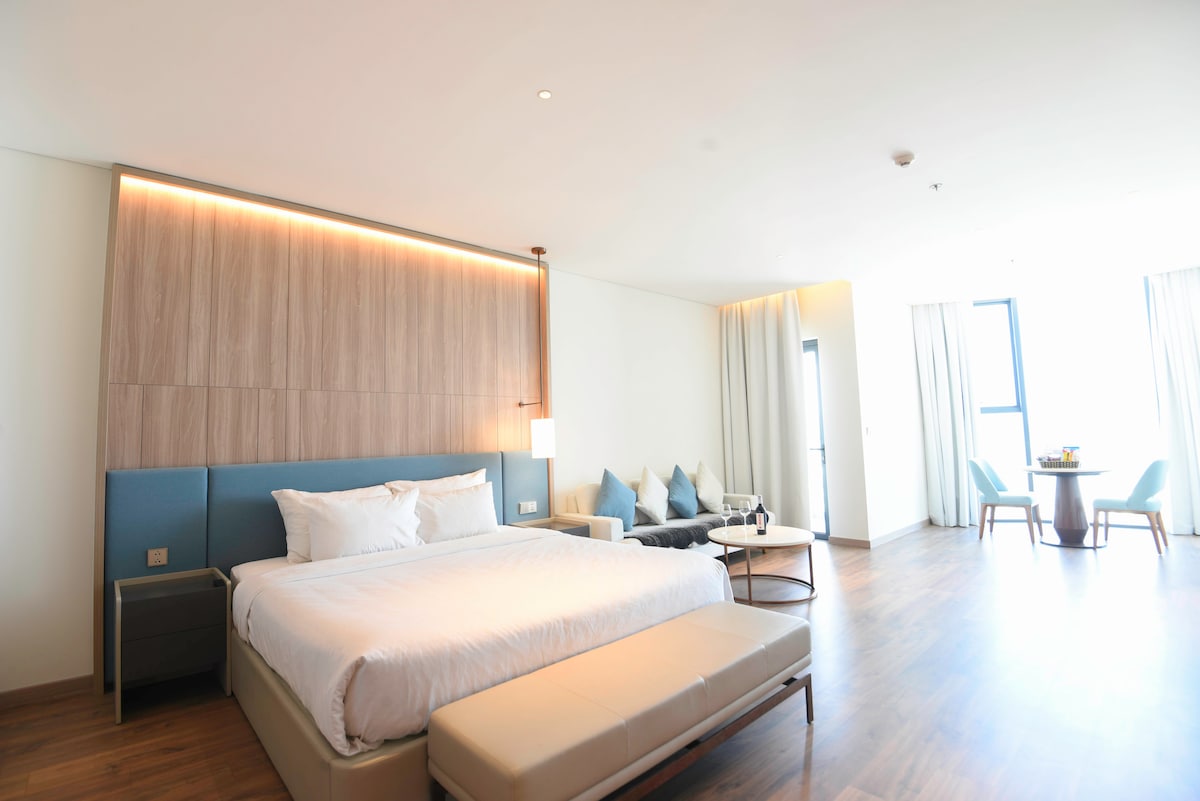 The apt is located in the heart of Halong Marina - Bai Chay Beach area, just steps from the beach and very close to cruise ports for Ha Long Bay tours. Enjoy a spacious studio with a king bed, sofabed, full kitchen, washing machine, and modern bathroom. Guests have access to an infinity pool, jacuzzi, spa, gym, and on-site parking for an extra fee. Perfect for relaxing stays, business trips, or exploring Ha Long Bay and Cat Ba Island. Our apt offers a relaxing and comfortable ambiance.