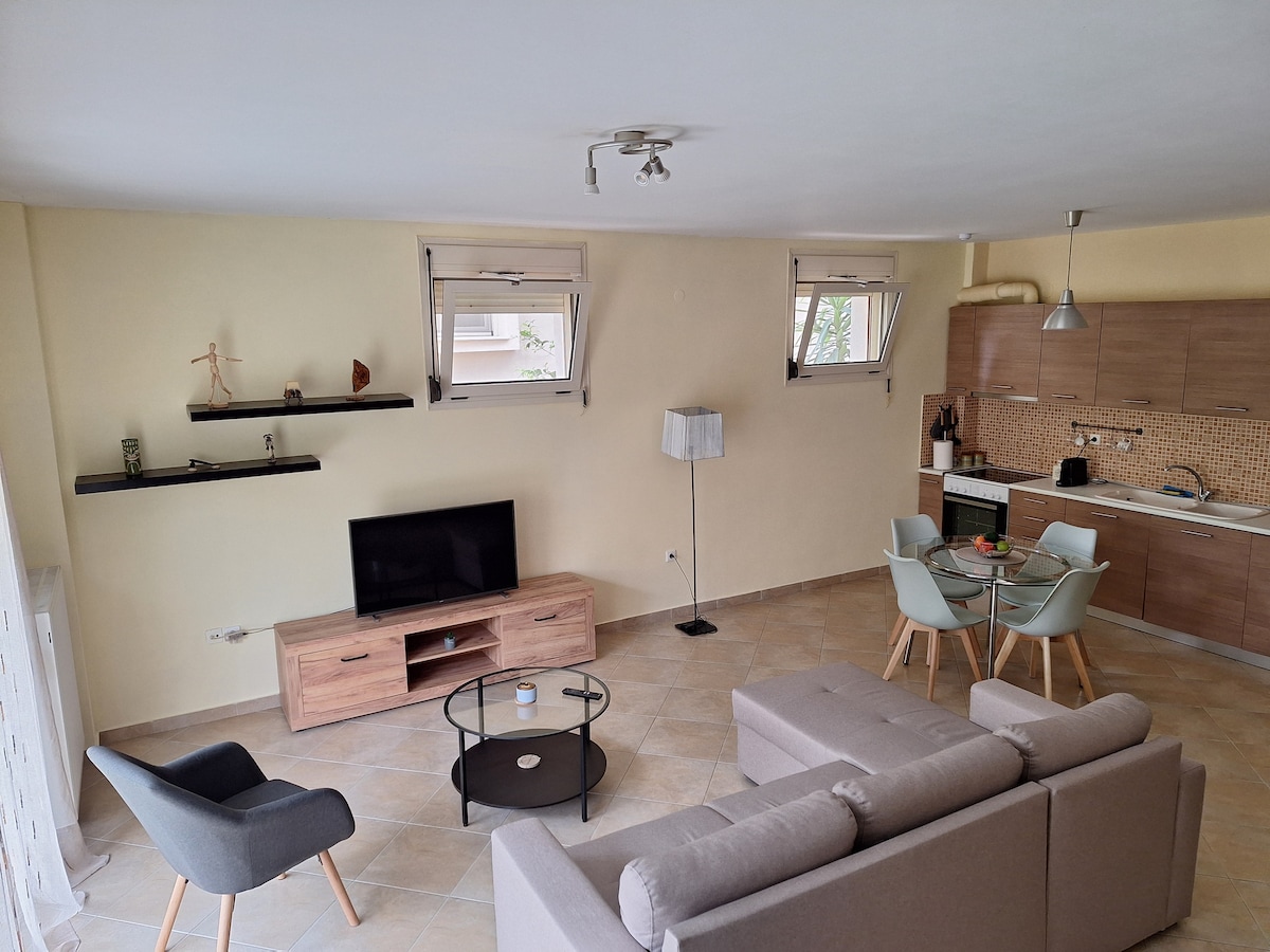 Căn hộ nằm ở tầng hai của một ngôi nhà hai tầng với lối trang trí hiện đại, bao gồm ba phòng, hai phòng tắm, nhà bếp, khu vực sử dụng BBQ, trong một khu nhà thoải mái, rất rộng và an toàn, rất gần một bãi biển đầy cát với biển trong vắt và cách trung tâm 2,5 km. Biển cách đó 100 m, trong khi làng Ormos Panagia cách đó 2 km và làng Agios Nikolaos cách đó 6 km. Khu phố yên ti ̃ nh và an toàn.