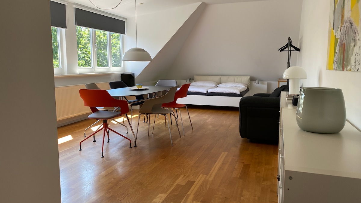 45qm Dachstudiowohnung in einem modernisierten, denkmalgeschützten Altbau mit Blick ins Grüne. Mit separatem großen Bad mit Dusche. Ruhige citynahe Lage, 10 Minuten Fußweg zur historischen Altstadt.