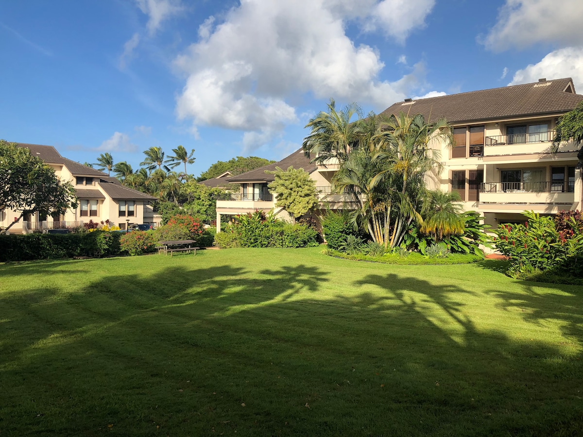 Khu phố đẹp. Không có đám đông trong căn hộ. Ngôi nhà hai phòng ngủ ở Poipu Beach Estates này có sân golf tuyệt đẹp và ngắm cảnh đại dương và hoàng hôn. Hồ bơi nước mặn và spa trong khuôn viên (có hàng rào để đảm bảo an toàn). Bếp phong cách gia đình được trang bị đầy đủ tiện nghi! Vita-mix trên bàn bếp. Khoảng cách đi bộ từ các nhà hàng tuyệt vời và lặn với ống thở hoành tráng.