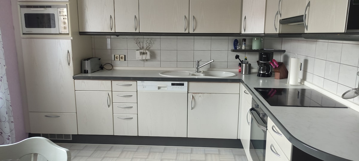 Herzlich Willkommen in meiner 95 qm großen, schön hellen Ferienwohnung! Ich freue mich immer darüber, nette Gäste zu begrüßen! Im Garten ist viel Platz zum Entspannen, Frühstücken, Spielen mit den Kindern oder netten Grillabenden - in der kühlen Jahreszeit könnt ihr es euch vor dem knisternden Kamin gemütlich machen und von Home-Office am Schreibtisch bis Wellness unter der Regenwalddusche oder in der Badewanne bietet die Wohnung alles was das Herz begehrt :)