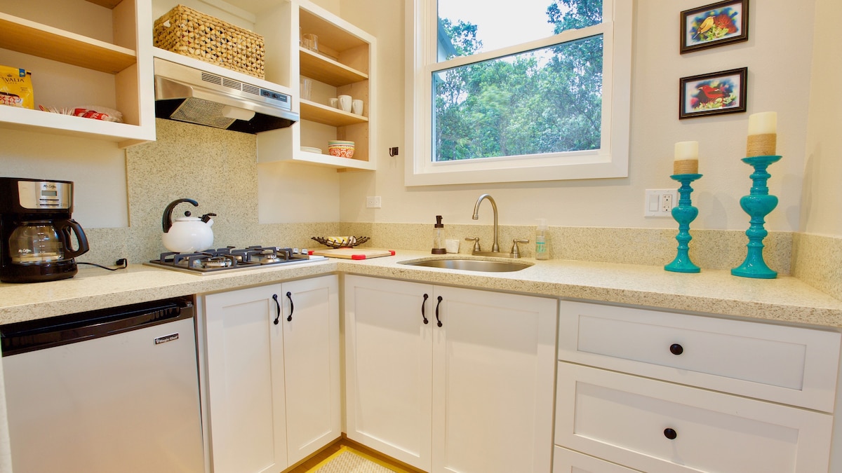 Nhà nghỉ thôn dã sạch sẽ, sáng sủa và được trang bị đầy đủ tiện nghi của chúng tôi cách Công viên Quốc gia Núi lửa 5 phút trong cộng đồng nghệ sĩ của Làng Volcano. Bạn sẽ có toàn bộ ngôi nhà nghỉ thôn dã cho riêng mình, được bao quanh bởi rừng nhiệt đới tươi tốt và tiếng chim bản địa. Ngồi vào buổi sáng trên hiên nhà riêng của bạn với một tách cà phê Kau trong khi thưởng thức bánh ngọt, trái cây và sữa chua do chủ nhà cung cấp. Khu phố của chúng tôi nằm ở rìa khu bảo tồn rừng, nơi có diều hâu, cú và một số loài chim đặc hữu cho Đảo Lớn (Đảo Hawaii).
