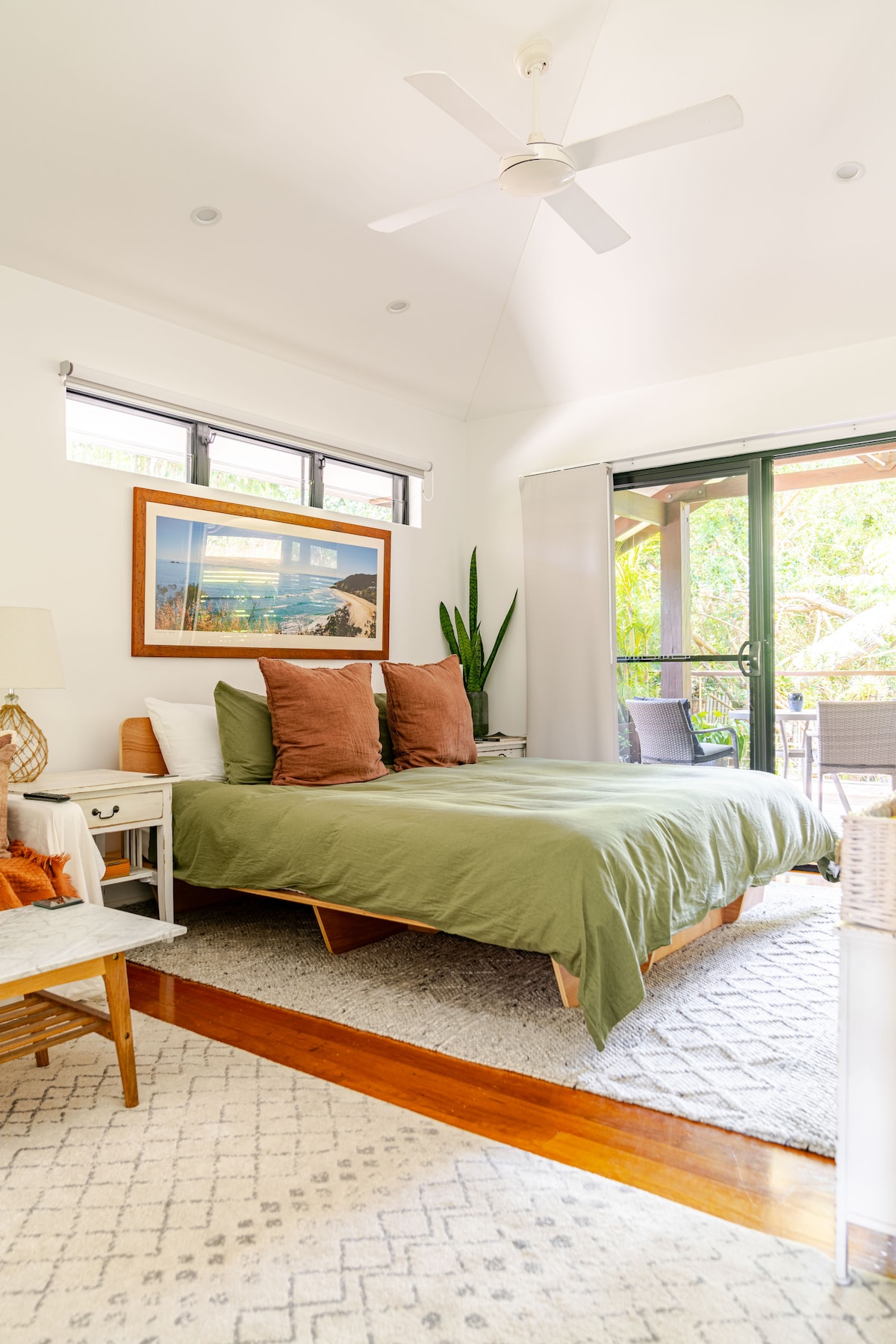 Set in a leafy cul-de-sac street in Byron Bay, the studio offers a sense of calm while still being conveniently close to everything. Byron’s town centre and iconic beaches are just a 2-minute drive or a brisk 15-minute walk (20-minute stroll). Take-away coffee and pastries are available in the morning from the Sunseeker coffee caravan which is situated at the top of the street, and the relaxing Byron Bathhouse is a 2-minute walk away for those wanting to unwind even further.