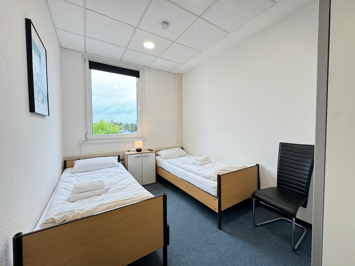 You have the whole unit with over 300 square meters to yourself! The floor comprises 10 rooms, including 2x twin rooms, 4x two-bed room, 2x triple room and 1x five-bed room and 1x four-bed rooms. Fully equipped shared kitchen, two shared bathrooms with showers for men & women and a shared toilet. Check-in via PIN code. INVOICE: If you need an invoice, please let us know the billing address and an e-mail address.