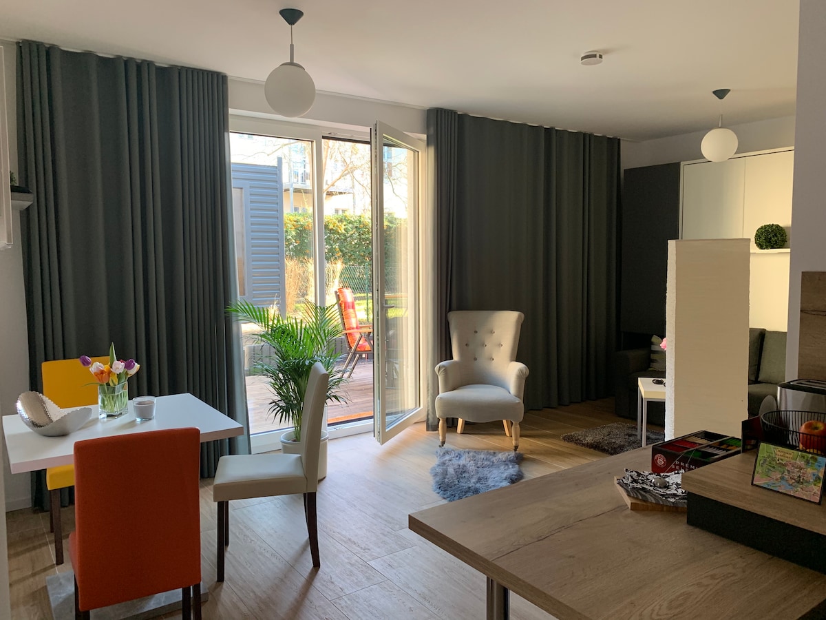 Chỗ ở được trang bị đầy đủ nằm ở tầng trệt với lối vào ở tầng trệt. Sau một quãng đi bộ ngắn (khoảng 3 phút), bạn có thể đến chỗ ở bằng các phương tiện giao thông công cộng khác nhau (tàu khu vực, xe điện, xe buýt). Bạn có thể mua sắm thực phẩm, hoa, sách, hiệu thuốc, dịch vụ cho thuê xe đạp, nhà hàng và dịch vụ pizza nhỏ trong vòng 200 mét đến chỗ ở. Mới từ ngày 09/2022: Tùy chọn, có thể đặt 1 chỗ đỗ xe tại chỗ ở với giá 5,00 €/đêm.