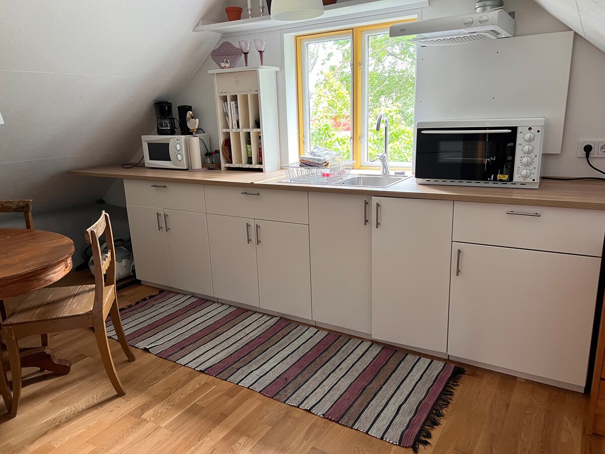 Lägenhet på övre plan på flygelbyggnad. 1 rum och kök. Badrum med dusch och wc. Balkong i söderläge med lite havsutsikt,ser lite av Stora Karlsö. Fint att äta frukost på balkongen och även sitta där på kvällen. Parasoll finns där. Även balkong i västläge som är fint på eftermiddag och kväll med utsikt över trädgården. Lugnt och naturen inpå knuten.