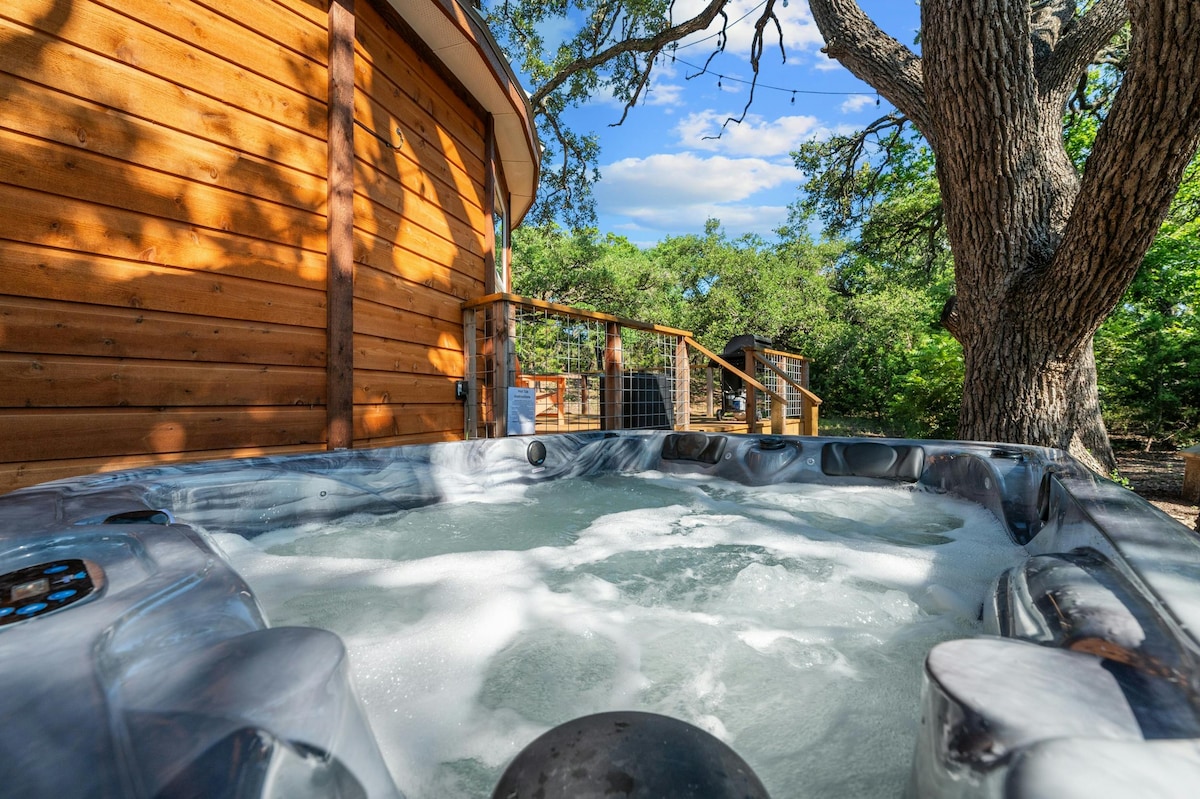 This one-of-a-kind Yurt in the Live Oak trees is your PERFECT getaway from city life! Located in the heart of Texas winery/brewery country, your day trips are only minutes away! This one bedroom (king) is hosted by Airbnb's 2022 Top New Host of the State of Texas! Relax in the private hot tub, stargaze, or sit around the fire on a 300+sq/ft deck surrounded by ancient live oak trees! The Hidden Oak Yurt is tucked away on a beautiful 9-acre property and offers all your modern amenities!
