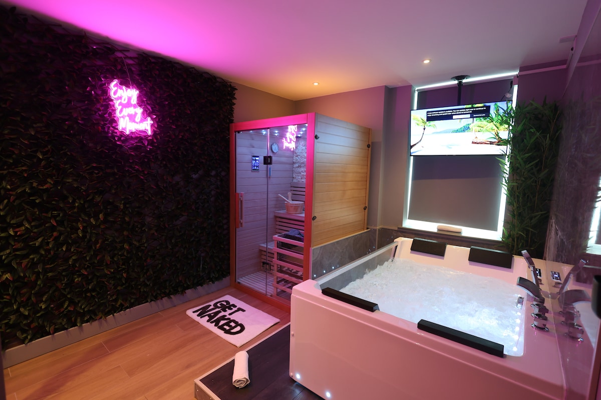 Escape to our chic flat, a serene urban oasis for 2, blending modern elegance with indulgent comfort. Sink into the bubbling warmth of your private jacuzzi and sauna after a day of London adventures, then recharge in a plush double bed, whip up snacks in the fully equipped mini-kitchen, or refresh in the spotless private bathroom. Nestled on a peaceful street near vibrant Finsbury Park, you're just a 10-minute stroll from Archway Tube, two stops to Camden's electric energy. .