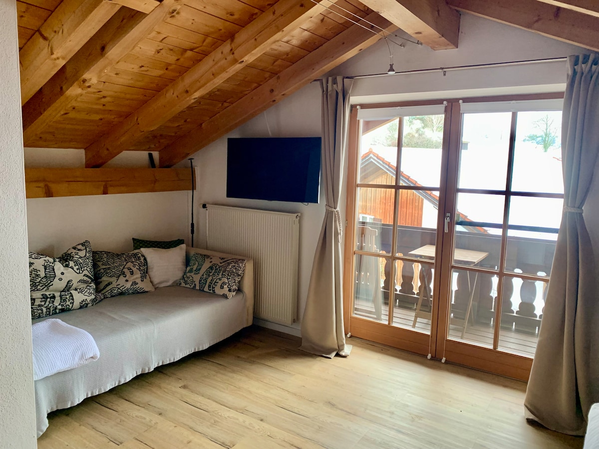 Căn hộ hướng về phía nam có tầm nhìn tuyệt vời ra thế giới núi cao Karwendel và Wetterstein. Nó gần đây đã được cải tạo và trang bị nội thất mới. Có các lựa chọn ngủ cho tối đa là 4 người - nhưng lý tưởng cho 2 - 3 người. Căn hộ chỉ dưới 40 m2 không gian sống rất sạch sẽ: phòng ăn - phòng khách (với bếp nhỏ rộng rãi, đầy đủ tiện nghi), phòng ngủ (có giường đôi rộng và nệm mới), phòng tắm ban ngày riêng, ban công hướng về phía nam, bãi đỗ xe riêng.