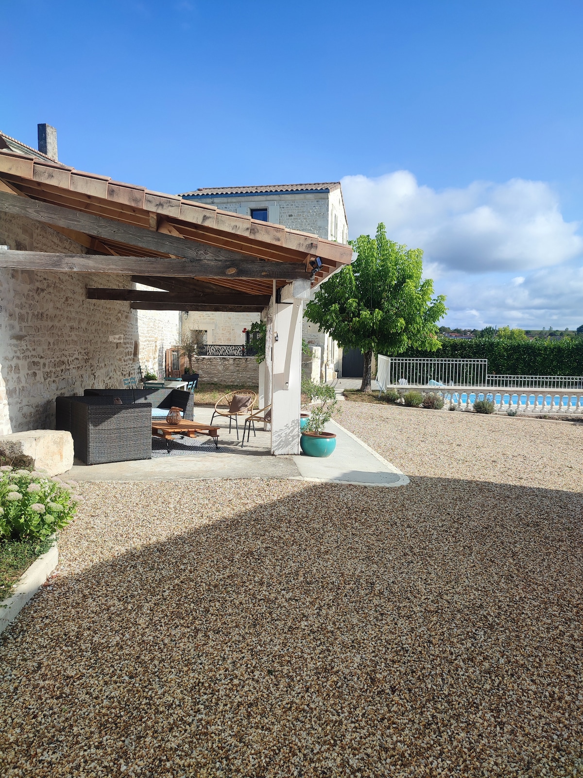 Trong ngôi nhà nông thôn của chúng tôi, chỉ cách Angouleme 12 phút, chúng tôi mời bạn ở trong căn hộ riêng rộng 50 m2 mà chúng tôi đã sắp xếp cho con cái của chúng tôi, gần đây đã được cải tạo hoàn toàn, trang bị và trang trí cẩn thận. 2 phòng ngủ, 1 phòng khách/phòng khách/nhà bếp với sofa giường và 1 phòng tắm/nhà vệ sinh. Từ tháng 6 đến tháng 9, bạn có thể sử dụng sân thượng và hồ bơi nước nóng miễn phí cũng như khu vực ăn uống/thư giãn ngoài trời riêng có bóng râm. Tối đa 6 khách.