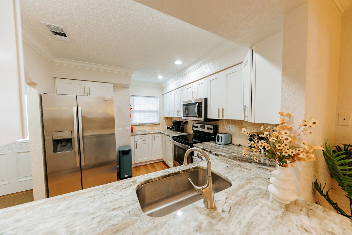 Enjoy a quiet stay in this fully remodeled home with high-end finishes. Located in a peaceful fenced property, just 1 min from shops and restaurants, and a short drive to Indian Rocks, Clearwater, and St. Pete Beach. Relax in the paved backyard under string lights, use the washer/dryer, and take advantage of the huge free parking for RVs or large vehicles. Only 12 mins from Clearwater/St. Pete Airport and 30 mins from Tampa Airport.