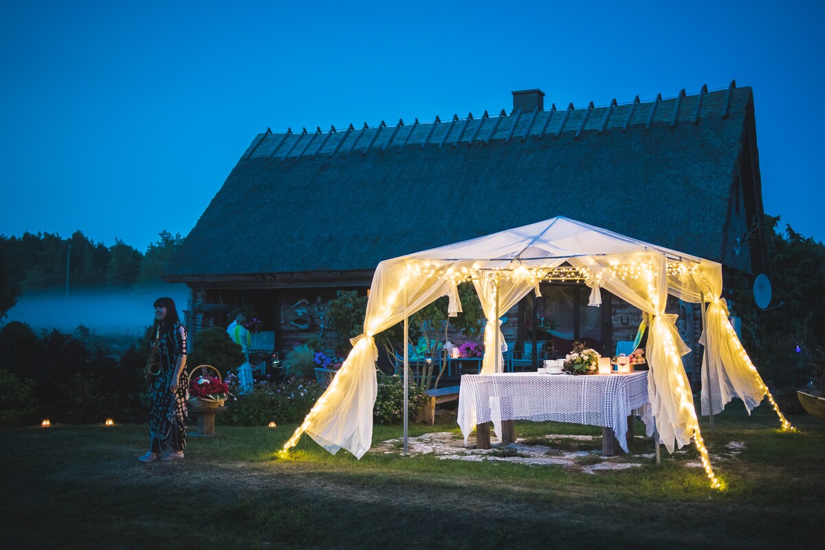 Large glamping tent in privacy in the middle of junipers forest. Enjoy sunbathing or reading on the terrace. The tent has a large double bed and a small sofa bed 110x198, which can accommodate 2 people; chairs, table, sunbeds; a cupboard in which there is a kettle, cups, plates, cutlery, etc. There is also 220v electricity. The grill, swimming pool, hot water shower and toilet are located near the tent and are shared. Option to order a sauna, hot tub, SUP boards, boat ride for an additional fee.