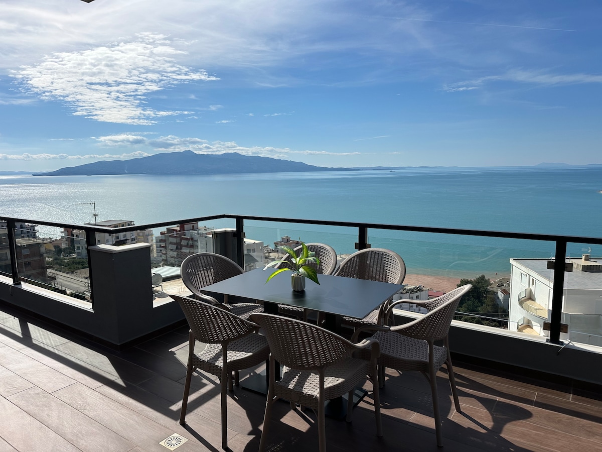 Trải nghiệm hoàng hôn ngoạn mục từ căn penthouse sang trọng rộng 200 m² này với tầm nhìn toàn cảnh Biển Ionian và Corfu, trong khoảng cách đi bộ đến bãi biển. Có 2 phòng ngủ, 2 phòng tắm, khu vực sinh hoạt rộng rãi, bếp đầy đủ tiện nghi và ban công riêng lớn. Đã bao gồm Wifi nhanh và bãi đỗ xe riêng. Một sự pha trộn hoàn hảo giữa sự thoải mái, riêng tư và tầm nhìn khó quên ở Saranda.