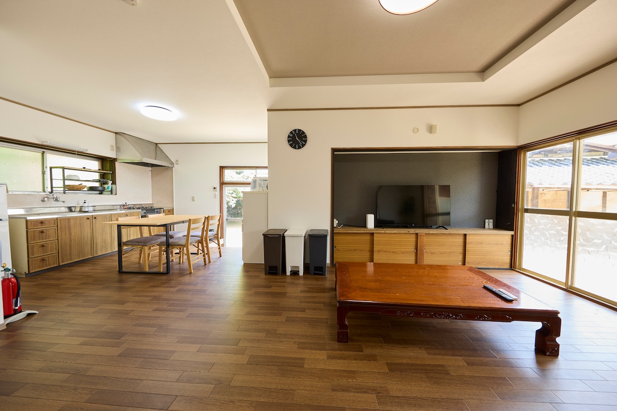 Tận hưởng khoảng thời gian tuyệt vời tại nhà cho thuê riêng thoải mái này nép mình trong một satoyama tự nhiên phong phú (khu vực núi nông thôn). Toàn bộ nhà cho thuê này chứa tối đa 6 khách với 6 bộ nệm futon được cung cấp. Thú cưng được chào đón. C*ó nhỏ có thể ở trong nhà bếp - khu vực đất liền kề, trong khi các giống chó khác sử dụng sàn bụi bẩn ở lối vào. Vui lòng tránh để thú cưng tự do đi lại trong nhà. Đây là một nơi lý tưởng cho những ai muốn thư giãn giữa thiên nhiên hoặc tận hưởng thời gian chất lượng với thú cưng của họ.