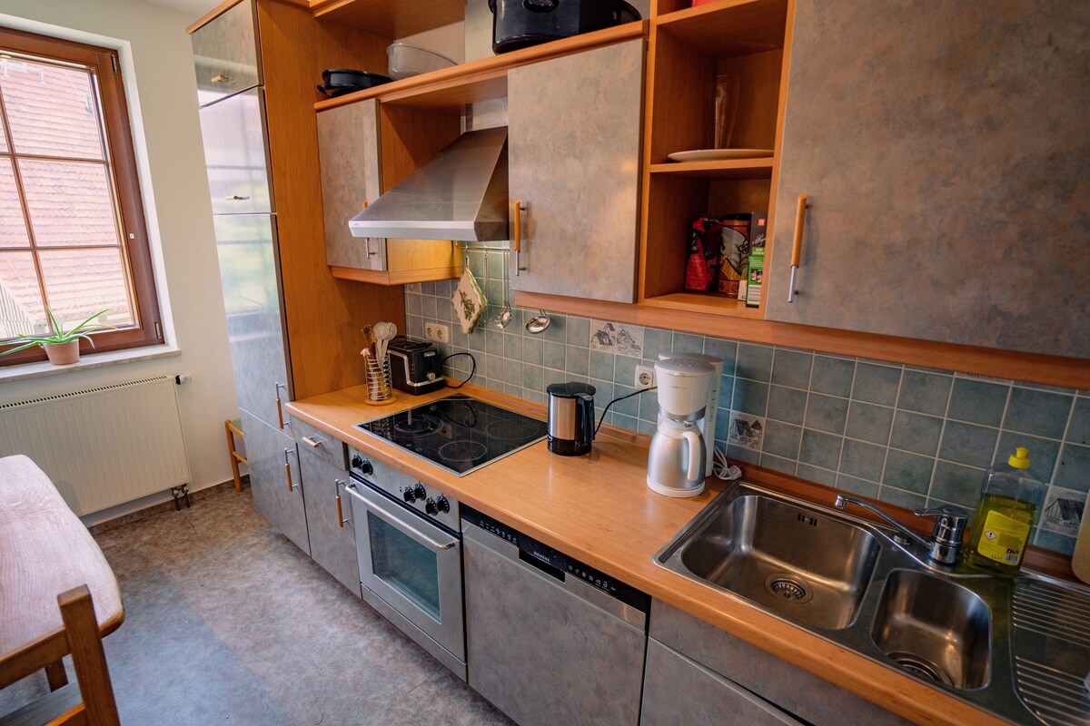 -Anfang 2024 haben wir für unsere Gäste neu renoviert und gemütlich gestaltet - Unsere ca. 40 m² große Nichtraucher- Ferienwohnung ist für 2-3 Personen. - Sie hat einen separaten Eingang und eine ruhige Sonnenterrasse. - Im großen Wohn- / Schlafraum befinden sich ein großes Doppelbett, eine Schlafcouch, ein großer Sessel und Sat-TV. - Die kleine moderne Küchenzeile bietet alle Möglichkeiten der Selbstverpflegung. - Das Bad ist mit Glasdusche, Fußbodenheizung und Föhn.