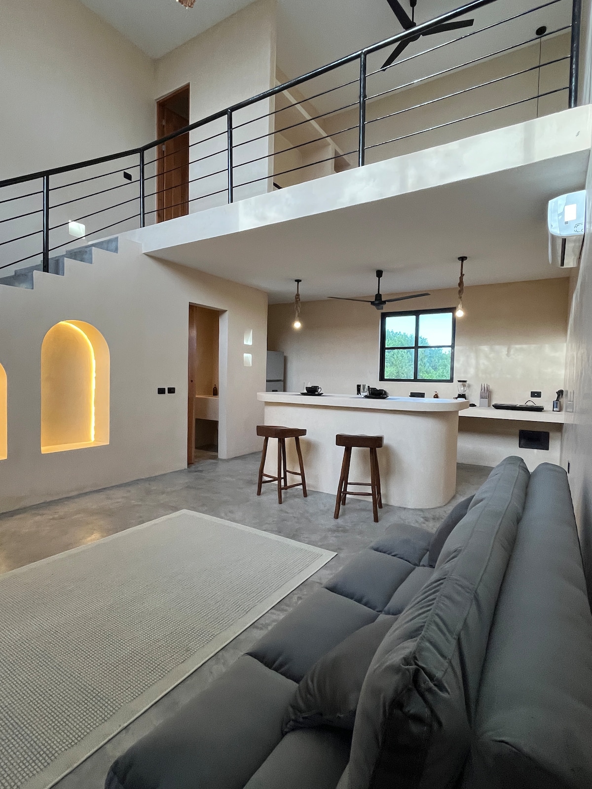 Hermoso apartamento en 2 niveles con Roof Top, cocina, baño, balcón, AC, 2 camas matrimoniales y 2 camas individuales. La isla de Holbox es un pueblito costero con calles de arena, ideal para quienes buscan desconectarse del ritmo acelerado de la ciudad, aquí el encanto está en lo simple y lo natural. Lofts Vulkay es para quienes valoran la sencillez, la calma de un lugar relajado; no tenemos el lujo de cadenas hoteleras, es para quienes desean disfrutar del auténtico caribe mexicano.