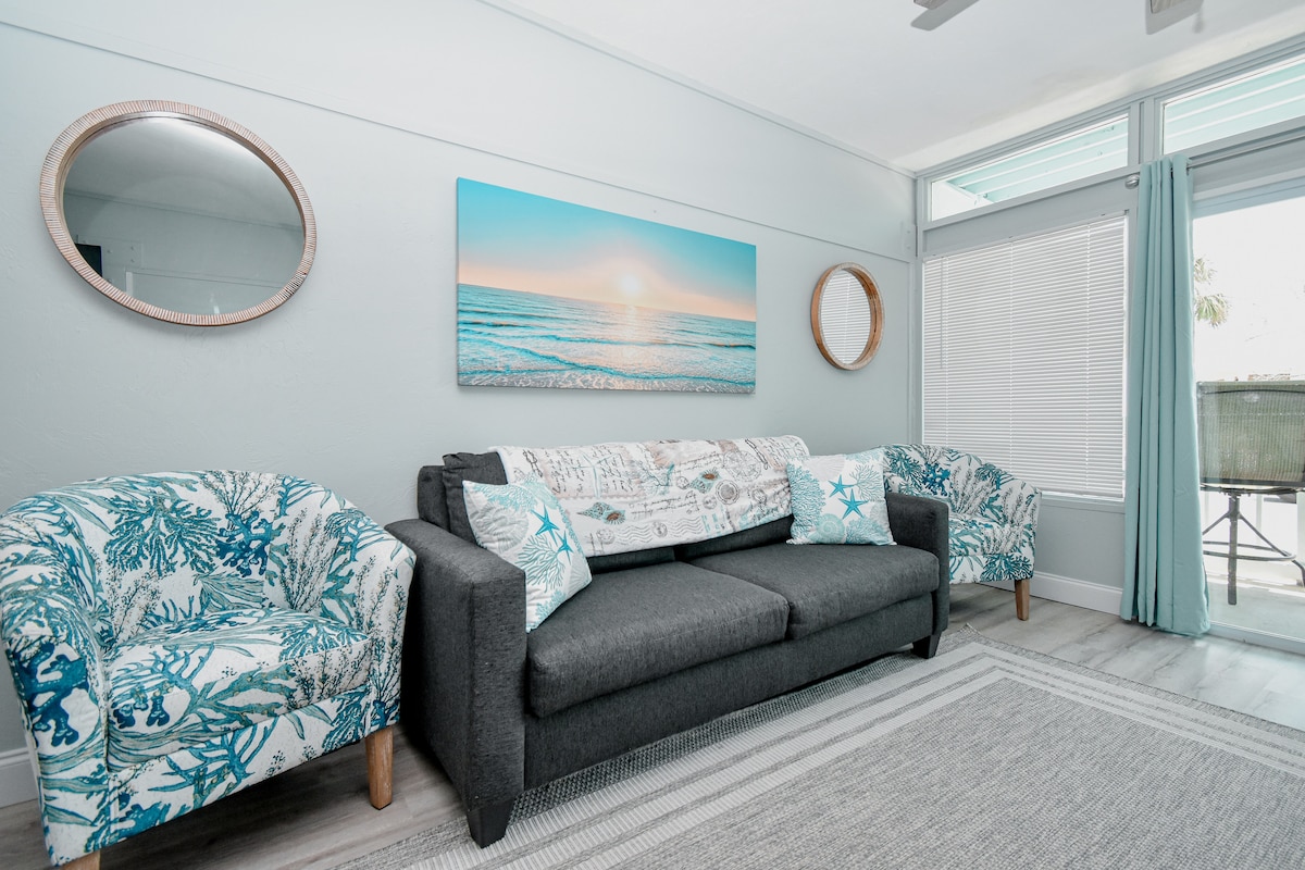 Chào mừng bạn đến với thiên đường Old Florida nhỏ bé của chúng tôi! Căn hộ tầng 1 được sửa sang lại hoàn toàn này có nhà bếp đầy đủ tiện nghi với tủ lạnh, mặt bếp và lò vi sóng. Khu vực phòng khách bao gồm 2 giường queen và ghế sofa ngủ kéo ra. Thưởng thức TV 65 inch hoặc thư giãn trên hiên nhà với tầm nhìn ra công viên thành phố, bãi biển và Vịnh Mỹ. Ghé thăm các cửa hàng quà tặng, nhà hàng và nhớ mang theo cần câu của bạn để tận hưởng tất cả các ốc đảo của chúng tôi!