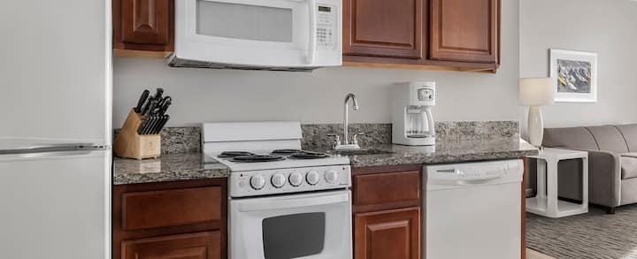 Nhà bếp 🍳 đầy đủ và khu vực ăn uống – nấu các món ăn yêu thích của bạn hoặc thưởng thức đồ ăn mang đi một cách thoải mái