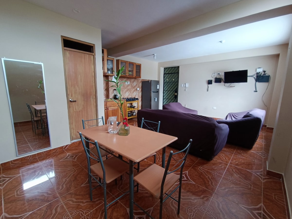 Tận hưởng một căn hộ ấm cúng ở Huánuco, chỉ cách Real Plaza và Plaza de Armas 5 phút. Nó có 1 phòng ngủ với giường đôi, bếp đầy đủ tiện nghi và khu vực sinh hoạt, phòng tắm có nước nóng và không gian giặt ủi. Bao gồm WiFi, TV 55inch với tính năng phát trực tuyến, tiện nghi thiết yếu và lối vào riêng. Chúng tôi hoan nghênh thú cưng và có chỗ đỗ xe công cộng. Hoàn hảo để có một kỳ nghỉ thoải mái và thư giãn. Rất mong được đón tiếp bạn!