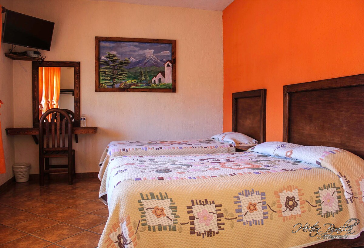 Somos un hostal que tiene dos habitaciones grandes, cada una con una cama matrimonial y 3 literas. Esta habitación tiene un medio baño privado y la regadera comunal. Tenemos una cocina bien equipada con utensilios e ingredientes básicos para cocinar. Tenemos cochera y áreas comunes espaciosas, cómodas y bien iluminadas. Estamos en una colonia sencilla pero cerca de hospitales, salonesde fiestas, el corredor de montaña y el centro a pocos minutos. Nuestros huéspedes disfrutan de un lugar limpio