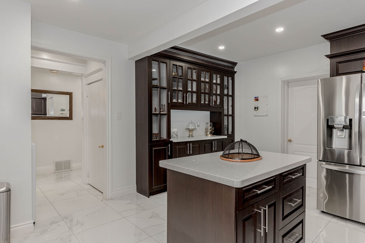 The stunning house in Etobicoke is only a few minutes from the Airport and City Centre. This spacious open concept, rare luxury modern home, is beautifully designed and decorated. It is a fully stocked home and will have everything you could ever wish for a short-term stay. Perfect for large families and groups! min age 25 yrs to book. Room 1 king bed Room 2 queen Room 3 twin and another twin roll out Room 4 queen no party policy or excessive noise. this is a quiet listing